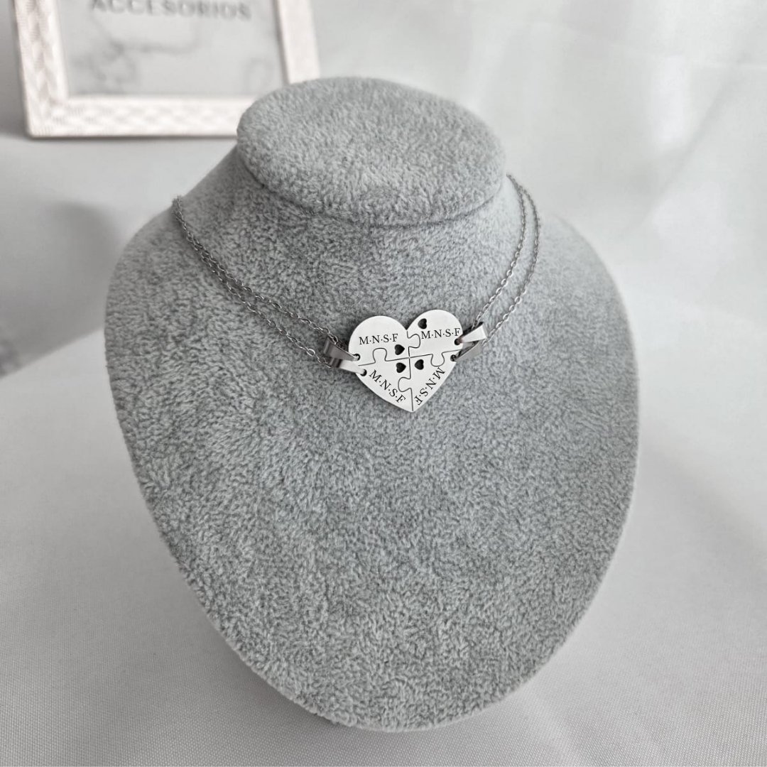 Medalla corazón rompezabezas brillo espejo del frente y satinado del reverso con 4 (cuatro) cadenas clasicas de 45cm